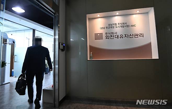 [성남=뉴시스] 김종택기자 = 자산관리업체 화천대유자산관리 등을 둘러싸고 정치권에서 특혜 논란이 거세지자 대장동 개발 의혹과 관련해 검경이 수사에 착수했다. 사진은 24일 경기도 성남시 분당구 대장동 개발 사업 특혜 의혹을 받고 있는 서판교에 위치한 자산관리회사 화천대유 사무실 입구 모습. 2021.09.24.