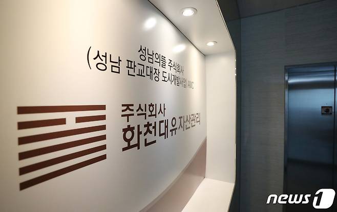 (성남=뉴스1) 김영운 기자 = 24일 오전 경기도 성남시 분당구 대장동 개발 사업 특혜 의혹을 받고 있는 화천대유 자산관리 사무실 입구의 모습. 2021.9.24/뉴스1