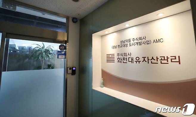 (성남=뉴스1) 김영운 기자 = 24일 오전 경기도 성남시 분당구 대장동 개발 사업 특혜 의혹을 받고 있는 화천대유 자산관리 사무실 입구의 모습. 2021.9.24/뉴스1