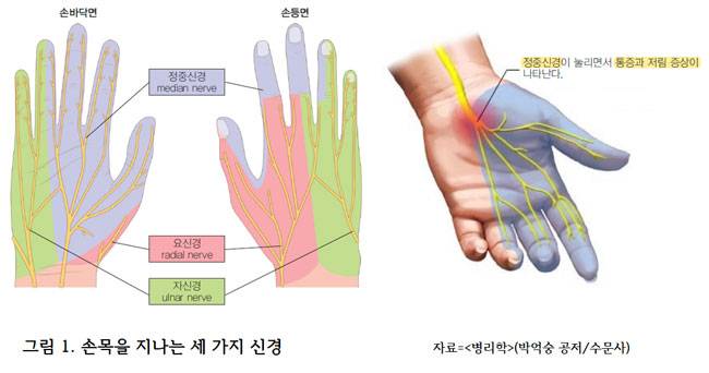 갑자기 손목 쓰는 집안일을 많이 하는 주부, 컴퓨터 프로그래머처럼 손목이나 손가락을 반복적으로 굽히는 작업을 하는 사람들은 손목굴(carpal tunnel) 안의 힘줄(tendon)에 ‘염증’이 생긴다. 염증이 생기면 그 공간이 좁아지면서 ‘정중신경’이 눌리게 된다. 보통은 통증과 저림 등의 감각 이상(paresthesia)이 나타나지만, 정중신경이 지배하는 부위 특히 엄지의 근육 위축(atrophy)이나 감각 소실 그리고 근육 마비 등도 올 수 있다.