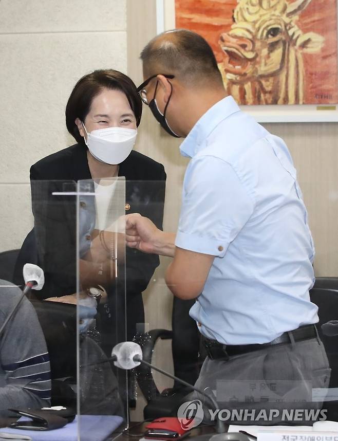 (서울=연합뉴스) 강민지 기자 = 유은혜 부총리 겸 교육부 장관이 24일 서울 영등포구 한국교육시설안전원 대회의실에서 열린 '장애인교육권 제고를 위한 교육부-장애인단체 간담회'에서 참석자와 인사하고 있다. 2021.9.24