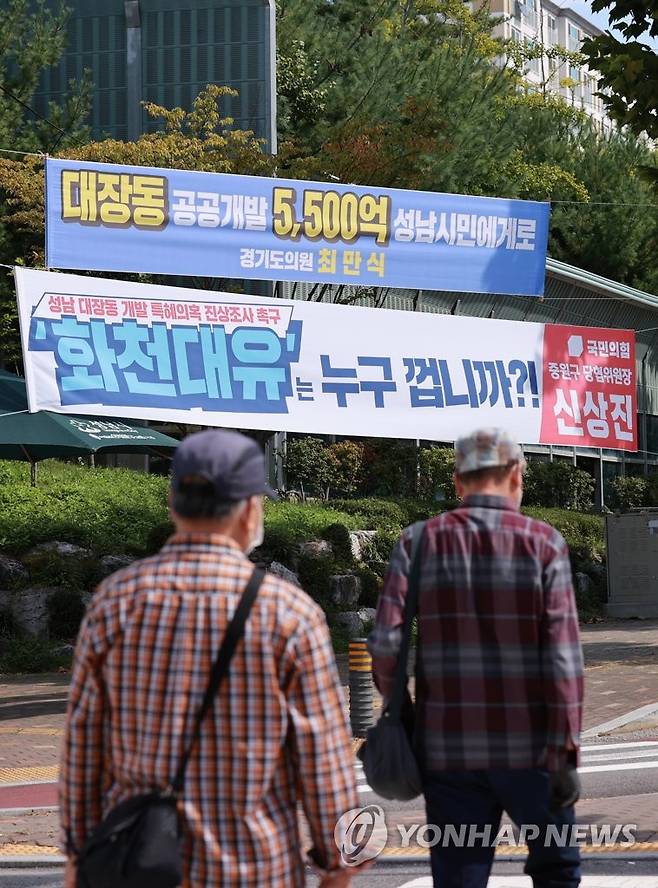(성남=연합뉴스) 홍해인 기자 = 24일 경기도 성남시청 인근 교차로에 성남 대장동 개발 사업과 관련해 더불어민주당 소속 경기도의회 의원과 국민의힘 지역 당협위원장 이름으로 상반된 의미의 현수막이 나란히 걸려 있다. 2021.9.24