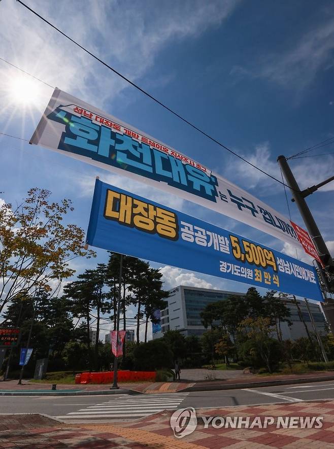 (성남=연합뉴스) 홍해인 기자 = 24일 경기도 성남시청 인근 교차로에 성남 대장동 개발 사업과 관련해 더불어민주당 소속 경기도의회 의원과 국민의힘 지역 당협위원장 이름으로 상반된 의미를 담은 현수막이 함께 걸려 있다. 현수막 너머로 성남시청의 모습이 보이고 있다. 2021.9.24