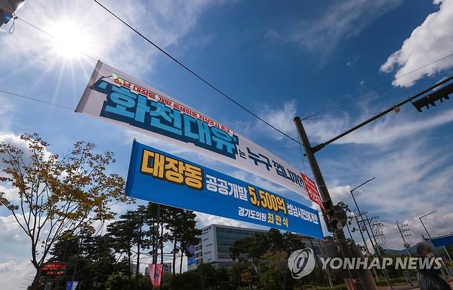 (성남=연합뉴스) 홍해인 기자 = 24일 경기도 성남시청 인근 교차로에 성남 대장동 개발 사업과 관련해 더불어민주당 소속 경기도의회 의원과 국민의힘 지역 당협위원장 이름으로 상반된 의미를 담은 현수막이 함께 걸려 있다. 현수막 너머로 성남시청의 모습이 보이고 있다. 2021.9.24