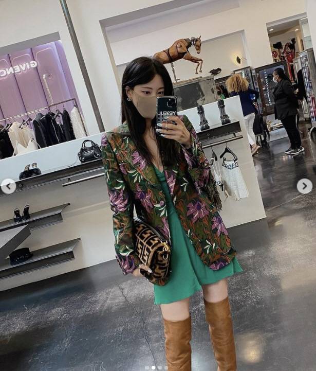 한예슬은 강렬한 플라워 프린팅 자켓에 원피스, 가을 느낌이 나는 롱부츠와 호피무늬 느낌의 명품백으로 그의 센스를 돋보이게 했다.