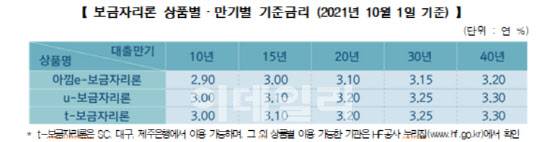 이에 따라 내달 1일 신청완료건을 기준으로 대출만기에 따라 직접 온라인으로 신청하는 ‘u-보금자리론‘과 은행 창구 방문을 통해 신청하는 ‘t-보금자리론‘은 연 3.00%(10년)부터 3.30%(40년)가 적용된다.