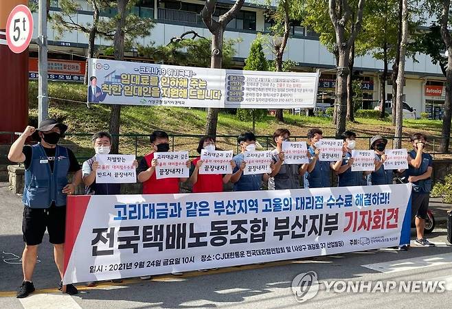 (부산=연합뉴스) 민주노총 전국택배노조 부산지부가 24일 오전 부산 CJ대한통운 전국대리점연합회 앞에서 부산지역 택배 대리점 고율 수수료 해결 촉구 기자회견을 하고 있다. 2021.9.24