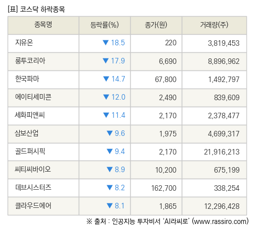 [fnRASSI]장마감, 코스닥 하락 종목(지유온 -18.5% ↓)