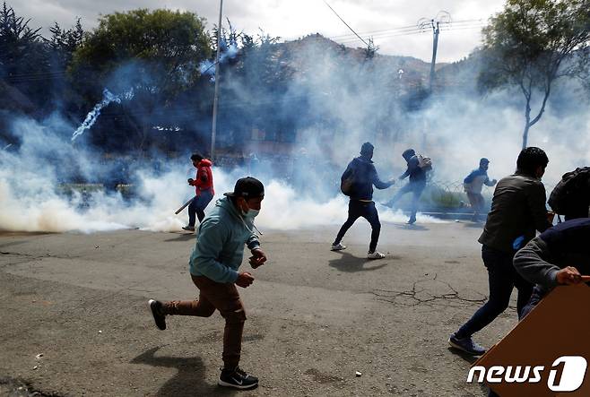 (라파스 로이터=뉴스1) 금준혁 기자 = 23일(현지시간) 전통코카시장의 변화를 반대하며 시위 중인 볼리비아 생산자들이 경찰의 최루가스를 피해 도망치고 있다. 코카의 잎은 코카인의 주원료다.