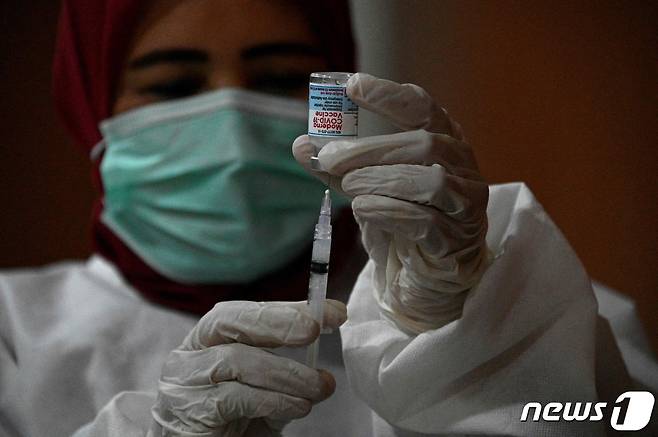(반다아체 AFP=뉴스1) 금준혁 기자 = 24일(현지시간) 인도네시아 의료인이 반다아체 컨벤션홀에서 모더나 백신을 접종할 준비를 하고 있다.