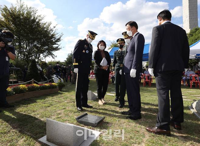 [이데일리 이영훈 기자] 김정수 육군사관학교 교장과 패트릭 E. 매트록 연합사 작전참모부장 등이24일 서울 노원구 육군사관학교 웨스트포인트 졸업생 추모공원에서 열린 '미국 육사 1947년 졸업생 6.25전쟁 참전 전사자 추모비 제막식'에 참석해 추모비를 바라보고 있다.
