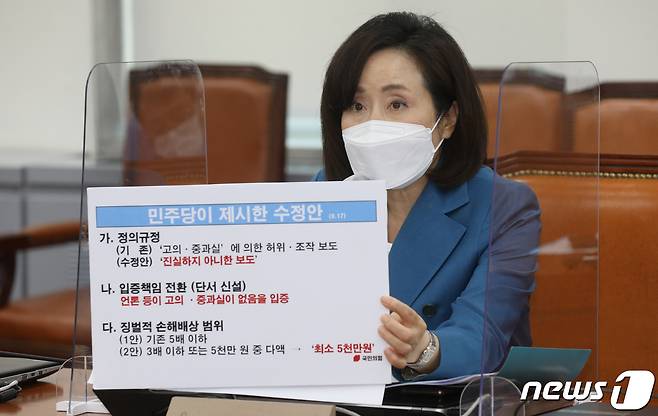 (서울=뉴스1) 이동해 기자 = 전주혜 국민의힘 의원이 24일 오후 서울 여의도 국회에서 열린 언론중재법 관련 8인 여야협의체 10차 회의에서 민주당이 제시한 수정안과 관련해 발언하고 있다. 2021.9.24/뉴스1