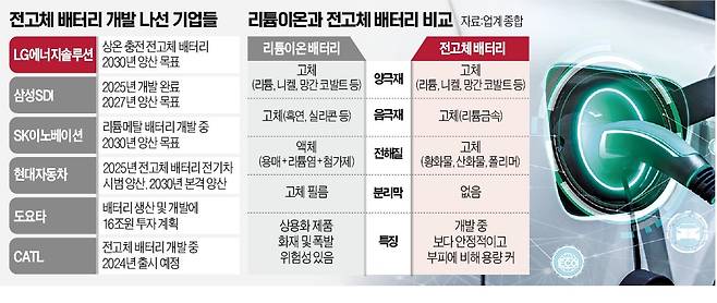배터리업계는 전고차 배터리 양산을 위한 기술 개발에 매진하고 있다. 삼성SDI는 2027년 상용화를 목표로 삼성전자 종합기술원 등과 전고체 배터리를 개발 중이다. 삼성전자 종합기술원은 지난해 3월 1회 충전으로 800㎞ 이상, 1000회 이상 충·방전이 가능한 전고체 배터리를 학술지 네이처 에너지에 공개한 바 있다. SK이노베이션은 노벨화학상 수상자인 존 굿이너프 미국 텍사스대 교수와 함께 전고체 배터리 중 하나인 리튬메탈 배터리를 연구해 2030년 양산한다는 목표다.