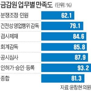 반면 금융사들이 소비자로서 금융 공기업·공공기관을 평가한 점수는 그리 높지 않았다. 2020년 고객(소비자) 만족도 조사 결과에 따르면 금감원이 종합 점수(100점 만점) 81.3점으로 가장 낮았다. 2019년 금감원 서비스를 받은 고객 1162명을 대상으로 조사한 결과다. 업무별로는 분쟁조정·민원이 62.1점으로 가장 점수가 낮았다. 인허가·승인·등록(93.2점)이 가장 높은 평가를 받았고, 건전성 영업행위 감독 79.1점, 검사제재 84.6점, 공시심사 87.9점, 회계감독 85.8점 등이었다. 한 금융사 관계자는 “2019년 사모펀드 사태 이후 과도하게 제재 일변도의 행정을 펴고, 분쟁 조정 절차를 질질 끌면서 업계 불만이 커졌다”고 했다. 나머지 기관별 점수는 신용보증기금이 89.7점으로 가장 높았고, 이어 예보(87.9점) 산업은행(87.0점) 주택금융공사(85.9점) 캠코(85.3점) 등의 순이었다.