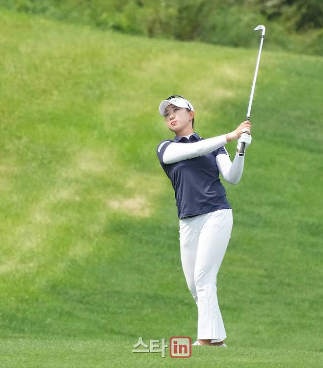 [이데일리 골프in(안산)=조원범 기자]24일 경기도 안산시 대부도에 위치한 아일랜드CC(파72.6613야드)에서 '엘크루-TV조선 프로 셀러브리티 2021'(총상금6억원,우승상금1억8백만원)1라운드가 열렸다.윤화영이 18번홀에서 경기를 하고 있다.