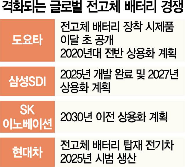업계에서는 전고체 배터리를 둘러싼 전 세계 주도권 경쟁이 더욱 심화하고 있다고 봤다. 현재 이 분야에서 가장 앞선 곳은 일본 도요타자동차다. 도요타는 이달 초 자사 유튜브 채널에 차량이 달리는 영상을 올리고 “세계 최초의 전고체 배터리 장착 프로토타입 자동차이며 정식으로 번호판을 받았다”고 공개했다. 전고체 배터리를 2020년대 전반에 상용화한다는 기존 계획도 재확인했다. 차량과 배터리를 한 덩어리로 개발해 배터리 비용을 절반 수준으로 낮추겠다는 목표도 세웠다. 이를 위해 오는 2030년까지 배터리 생산·개발에 1조 5,000억 엔(약 16조 원)을 투자하기로 했다. 한국 배터리업체 중에서는 삼성SDI가 양산 시점이 가장 빠를 것으로 전망된다. 삼성SDI는 2025년 전고체 배터리 개발을 완료해 2027년에 상용화한다는 목표다. LG에너지솔루션은 2027년 이후 SK이노베이션은 2030년 이전 각각 상용화 계획을 세웠다. SK이노베이션의 경우 배터리 연구 조직 내 차세대 배터리 전담 조직을 두며 기술 개발에 속도를 내고 있다. 현대차는 전고체 배터리 탑재 전기차를 2025년 시범 생산하고 2030년 본격 양산한다는 계획이다.