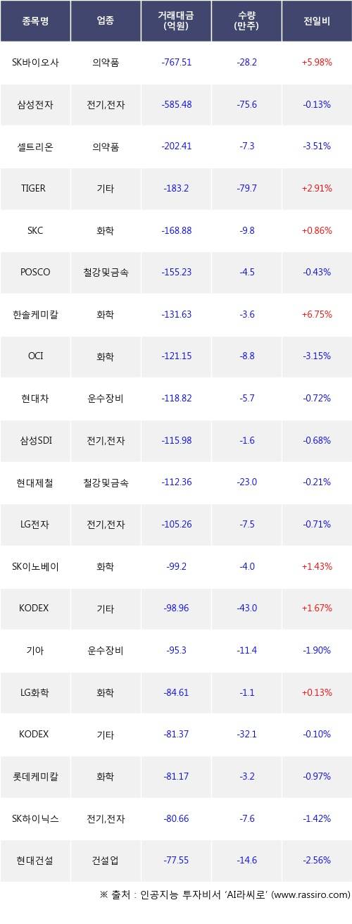 기관 투자자의 순매도 상위 20개 종목은 SK바이오사이언스, 삼성전자, 셀트리온, TIGER 2차전지테마, SKC, POSCO, 한솔케미칼, OCI, 현대차, 삼성SDI등이다.