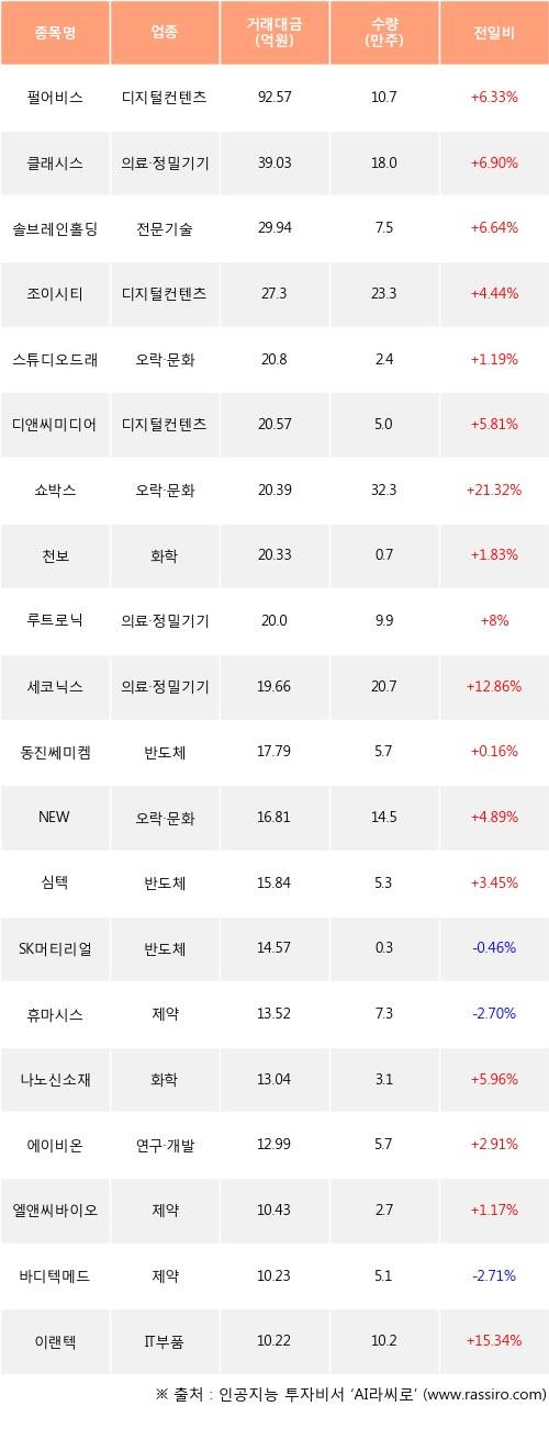기관 투자자의 순매수 상위 20개 종목은 펄어비스, 클래시스, 솔브레인홀딩스, 조이시티, 스튜디오드래곤, 디앤씨미디어, 쇼박스, 천보, 루트로닉, 세코닉스등이다.