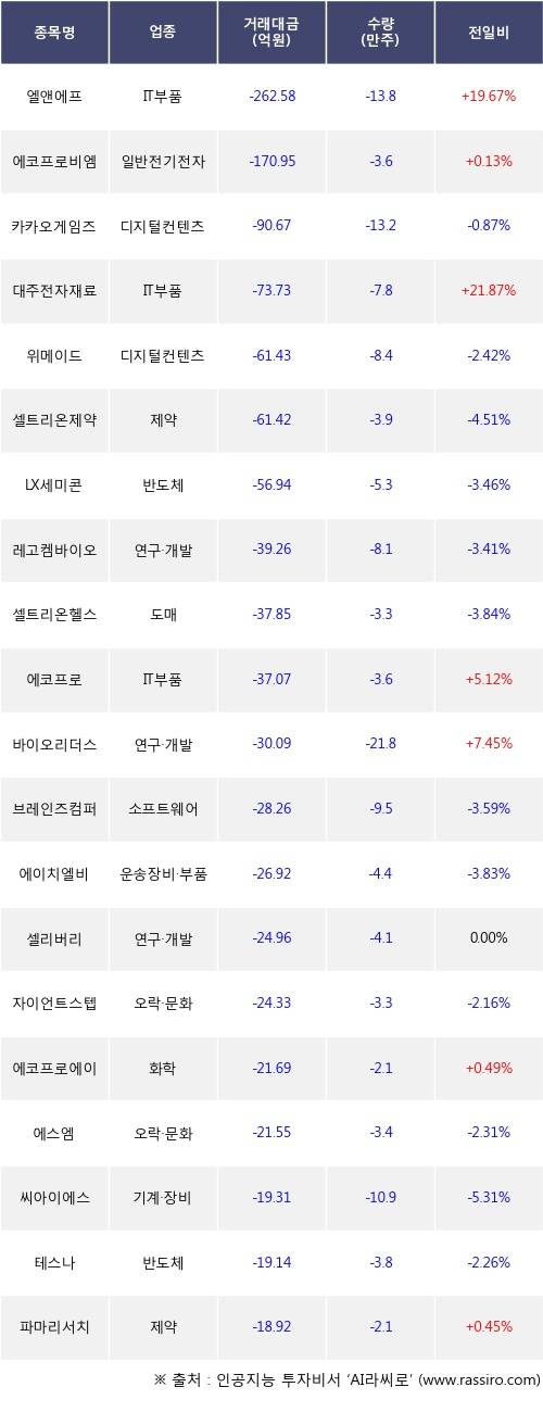 기관 투자자의 순매도 상위 20개 종목은 엘앤에프, 에코프로비엠, 카카오게임즈, 대주전자재료, 위메이드, 셀트리온제약, LX세미콘, 레고켐바이오, 셀트리온헬스케어, 에코프로등이다.