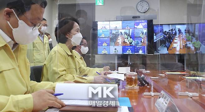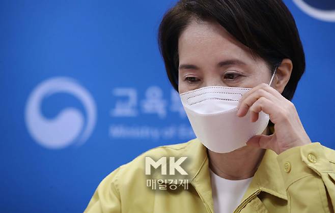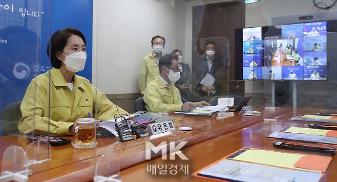 유은혜 사회부총리 겸 교육부 장관이 24일 서울 종로구 정부서울청사에서 열린 교육부장관-시도교육감 간담회에서 모두발언을 하고 있다. 이번 간담회는 12-17살 소아·청소년의 백신 접종 시행을 교육당국이 지원하기 위해 마련됐다.