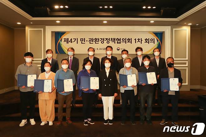(서울=뉴스1) = 한정애 환경부 장관이 24일 서울 영등포구 켄싱턴호텔에서 열린 ‘제4기 민·관환경정책협의회 위촉식 및 1차 회의’에 참석해 위원들과 기념촬영 하고 있다.(환경부 제공) 2021.9.4/뉴스1