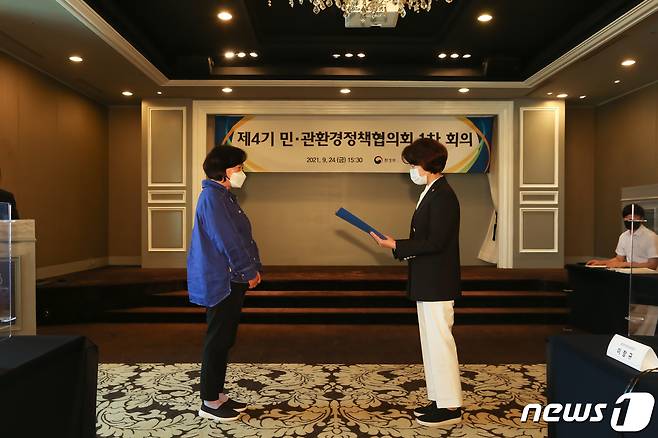 (서울=뉴스1) = 한정애 환경부 장관(오른쪽)이 24일 서울 영등포구 켄싱턴호텔에서 열린 ‘제4기 민·관환경정책협의회 위촉식 및 1차 회의’에 참석해 김미화 공동위원장에게 위촉장을 수여하고 있다.(환경부 제공) 2021.9.4/뉴스1