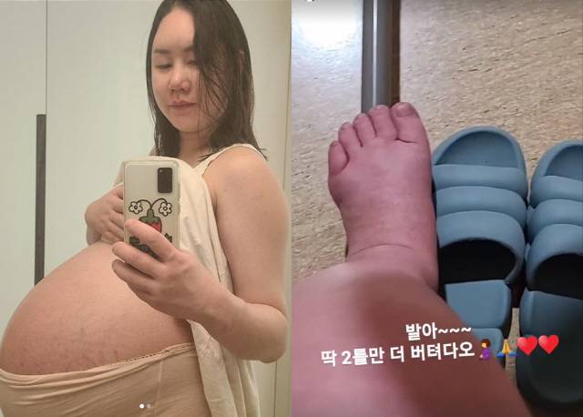영상 속에는 지난 16일 황신영이 "발이 너무 부어서 아프기까지 하네요. 발이 코끼리를 지나서 이제는 대왕 하마. 이젠 남편 신발도 안 맞아요. 일주일만 버티자 버티자 외치면서 버티고 있는데 쉽지 않네요"라는 글과 함께 퉁퉁 부은 발 사진을 공개했을 당시보다 훨씬 더 심하게 부은 모습.