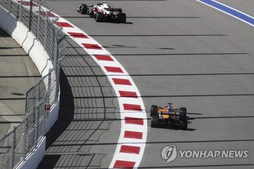 epa09485205 Italian Formula One driver Antonio Giovinazzi (L) of Alfa Romeo Racing ORLEN and Australian Formula One driver Daniel Ricciardo (R) of McLaren F1 Team in action during the first practice session of the 2021 Formula One Grand Prix of Russia at the Sochi Autodrom race track in Sochi, Russia, 24 September 2021. The Formula One Grand Prix of Russia will take place on 26 September 2021. EPA/Yuri Kochetkov