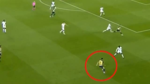 순간 방향을 틀어 상대 수비를 당황하게 만들고 두 명 사이로 과감하게 툭 공을 보냅니다.