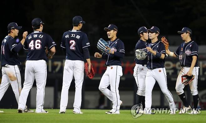 (광주=연합뉴스) 조남수 기자 = 24일 광주-기아챔피언스필드에서 열린 2021 프로야구 두산 베어스와 KIA 타이거즈의 경기에서 8-2로 KIA를 꺾고 7연승을 질주한 두산 선수들이 기뻐하고 있다. 2021.9.24
