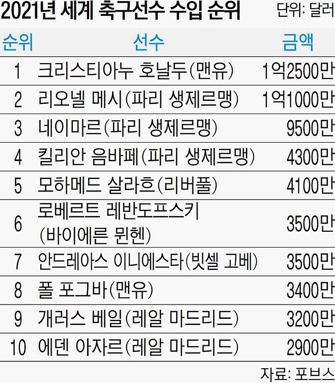 눈에 띄는 것은 상위 4명 가운데 3명이 PSG 소속 선수라는 점이다. PSG가 세계 축구계의 ‘큰손’임을 입증한 셈이다. 리버풀에서 뛰고 있는 모하메드 살라흐가 4100만달러(약 482억원)로 5위에 올랐다. 이집트 태생의 살라흐는 유럽과 남미가 아닌 다른 대륙 출신 선수로는 유일하게 수입 톱10에 이름을 올렸다. 또 7위에는 전 스페인 대표팀 미드필더 안드레아스 이니에스타(3500만달러)가 랭크돼 눈길을 끌었다. 일본 J리그 빗셀 고베에서 뛰고 있는 이니에스타는 유럽 이외의 리그에서 뛰는 선수로 유일하게 수입 톱10에 포함됐다.
