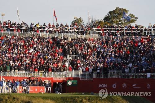 epa09485522 The US Team's Collin Morikawa hits his tee shot on the first hole as fans fill the stands on the first tee during the Foursomes matches on the first day of the pandemic-delayed 2020 Ryder Cup golf tournament at the Whistling Straits golf course in Kohler, Wisconsin, USA, 24 September 2021. Competition for the 43rd Ryder Cup between the US and Europe begins 24 September 2021. EPA/ERIK S. LESSER
