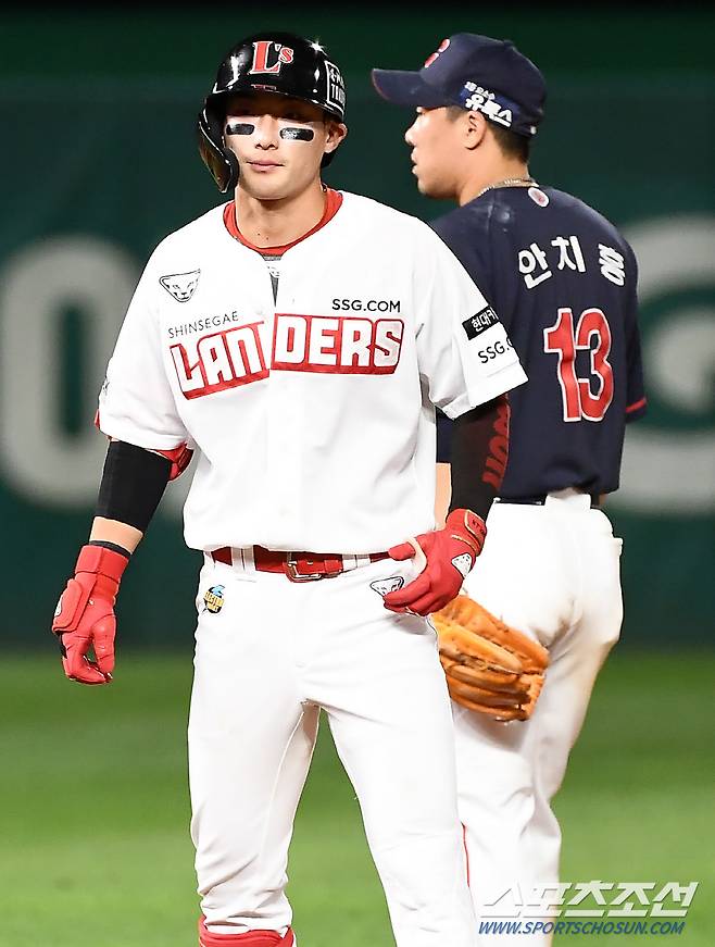 2021 KBO리그 SSG 랜더스와 롯데 자이언츠의 경기가 24일 인천SSG랜더스필드 열렸다. 7회말 1사 3루 SSG 최지훈이 역전 적시타를 날린 뒤 숨을 고르고 있다. 인천=박재만 기자 pjm@sportschosun.com/2021.09.24/