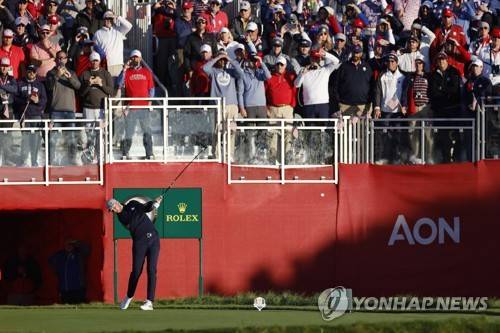 epa09485529 The US Team's Danel Berger hits his tee shot on the first hole as fans fill the stands on the first tee during the Foursomes matches on the first day of the pandemic-delayed 2020 Ryder Cup golf tournament at the Whistling Straits golf course in Kohler, Wisconsin, USA, 24 September 2021. Competition for the 43rd Ryder Cup between the US and Europe begins 24 September 2021. EPA/ERIK S. LESSER