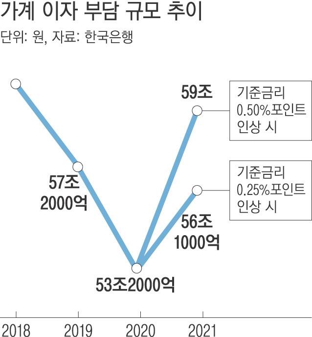 보고서를 보면 기준금리가 각각 0.25%포인트, 0.5%포인트 인상될 경우 가계의 연간 이자 부담은 2020년 말과 비교해 각각 2조9000억원, 5조8000억원 증가하는 것으로 추산됐다. 대출자 1인당 연이자 부담도 지난해 말 271만원에서 각각 286만원, 301만원으로 오른다.