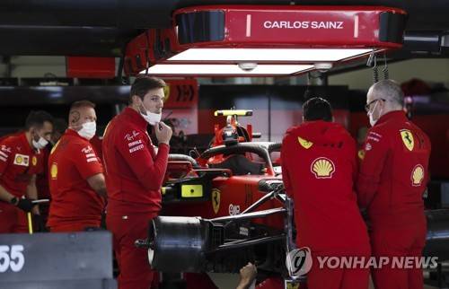 epa09485581 Mechanics work on the car of Spanish Formula One driver Carlos Sainz of Scuderia Ferrari Mission Winnow during the second practice session of the 2021 Formula One Grand Prix of Russia at the Sochi Autodrom race track in Sochi, Russia, 24 September 2021. The Formula One Grand Prix of Russia will take place on 26 September 2021. EPA/Yuri Kochetkov