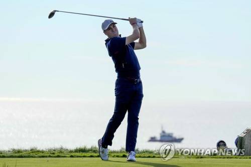 Team USA's Justin Thomas hits a drive on the ninth hole during a foursome match the Ryder Cup at the Whistling Straits Golf Course Friday, Sept. 24, 2021, in Sheboygan, Wis. (AP Photo/Ashley Landis)