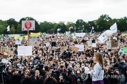epa09485715 Swedish climate activist Greta Thunberg delivers a speech at the Fridays For Future global climate action day in Berlin, Germany, 24 September 2021. Climate activists of Fridays For Future call for socially fair and consistent measures to limit climate heating to 1.5 degrees Celsius ahead of German federal elections, that take place on 26 September 2021. The young activists are planning hundreds of protests and demonstrations worldwide during a 'climate strike' on 24 September 2021. EPA/CLEMENS BILAN