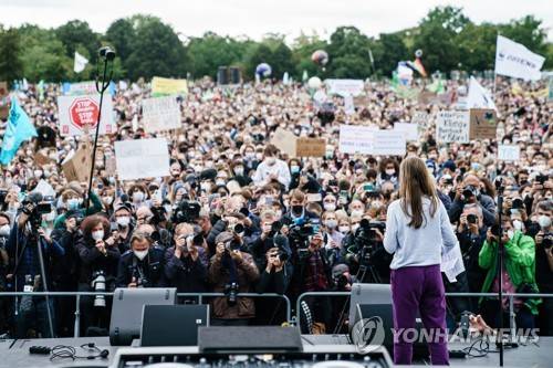 epa09485716 Swedish climate activist Greta Thunberg delivers a speech at the Fridays For Future global climate action day in Berlin, Germany, 24 September 2021. Climate activists of Fridays For Future call for socially fair and consistent measures to limit climate heating to 1.5 degrees Celsius ahead of German federal elections, that take place on 26 September 2021. The young activists are planning hundreds of protests and demonstrations worldwide during a 'climate strike' on 24 September 2021. EPA/CLEMENS BILAN