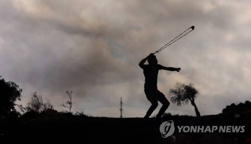 epa09485733 A Palestinian protester throws stones during clashes with Israeli security forces after a protest against Israeli settlements, on the lands of Beita village near the West Bank city of Nablus, 24 September 2021. EPA/ALAA BADARNEH