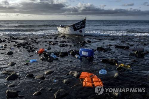 FILE - In this Oct. 16, 2020 file photo, a wooden boat used by migrants from Morocco sits on the shore on the coast of the Canary Island of Gran Canaria, Spain. Migrant deaths along the Atlantic route from West Africa to Spain's Canary Islands reached a record high last month with 379 lives lost, the International Organization for Migration said Friday Sept. 24, 2021. Those deaths account for nearly half the total number of casualties for all of 2021, 735 adults and 50 children, according to the United Nations agency's Missing Migrants Project. (AP Photo/Javier Bauluz, File) OCT. 16, 2020 FILE PHOTO