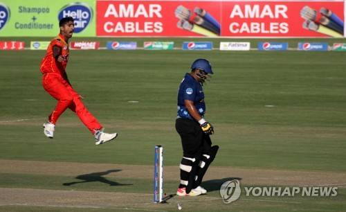 epa09485780 Shahnawaz Dahani (L) of Sindh celebrates the dismissal of Sothren Punjab Batsman Azam Khan during the Pakistan National T20 cup cricket match between Southern Punjab and Sindh in Rawalpindi, Pakistan, 24 September 2021. EPA/SOHAIL SHAHZAD