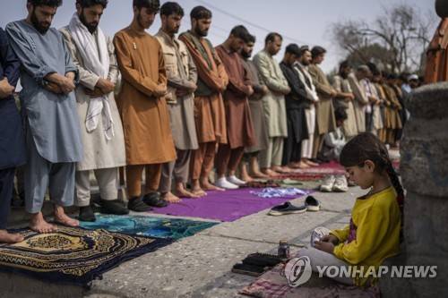 An Afghan girl working as a shoe cleaner sits in the street while men pray during Friday prayers in Kabul, Afghanistan, Friday, Sept. 24, 2021. (AP Photo/Bernat Armangue)