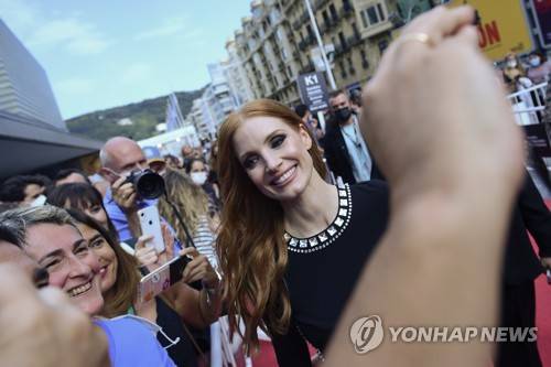 US actress Jessica Chastain poses close to her fans along the red carpet at the 69th San Sebastian Film Festival, in San Sebastian, northern Spain, Friday, Sept. 24, 2021. (AP Photo/Alvaro Barrientos)