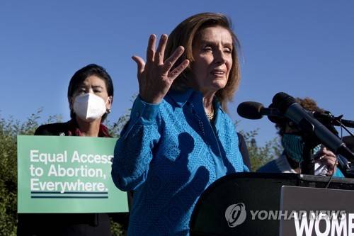 epa09485787 US Speaker of the House Nancy Pelosi (Front) speaks during a news conference in front of Democratic Representative from California Judy Chu, before the House of Representatives votes on the 'Women's Health Protection Act', on Capitol Hill in Washington, DC, USA, 24 September 2021. The legislation is intended to guarantee access to abortions, countering a new Texan law which restricts abortions to within six weeks of pregnancy. EPA/MICHAEL REYNOLDS