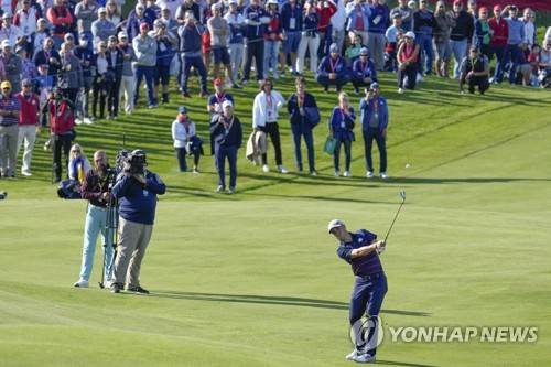 Team USA's Justin Thomas hits on the 12th hole during a foursome match the Ryder Cup at the Whistling Straits Golf Course Friday, Sept. 24, 2021, in Sheboygan, Wis. (AP Photo/Ashley Landis)