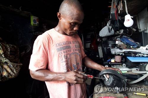 epa09486242 Oliver Grear makes repairs at a electrical shop in West Point slum coastal community of Monrovia, Liberia, 24 September 2021. Oliver a professional electrical repairer, who started at age 13, by picking up old electrical appliances from dumpsites to practice repairing. He trained four youths in the profession, and later seek refuge in the Ivory Coast, during the Liberian civil war, in which the profession enables him earn some money to take care of himself and family. EPA/AHMED JALLANZO