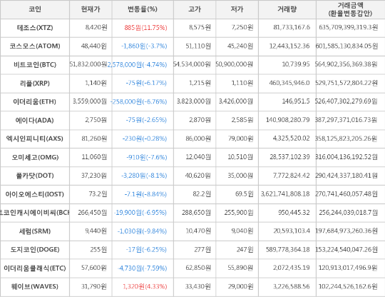 또한, 아이오에스티(-8.84%, 73.2원), 폴카닷(-8.1%, 37,230원), 오미세고(-7.6%, 11,060원), 이더리움클래식(-7.59%, 57,600원), 비트코인캐시에이비씨(-6.95%, 266,450원), 이더리움(-6.76%, 3,559,000원), 도지코인(-6.25%, 255원), 리플(-6.17%, 1,140원), 코스모스(-3.7%, 48,440원), 에이다(-2.65%, 2,750원), 엑시인피니티(-0.28%, 81,260원)가 하락세를 나타냈다.