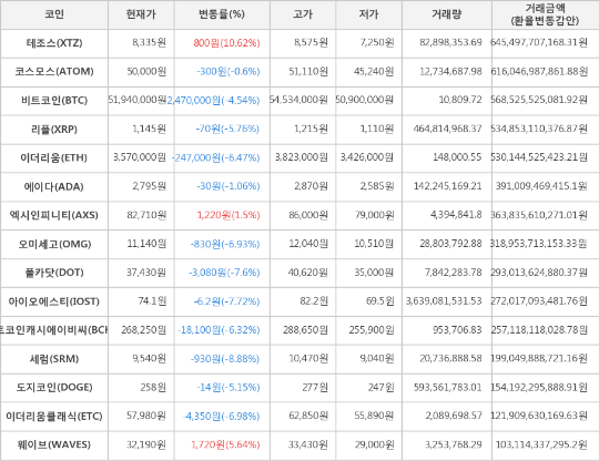 또한, 아이오에스티(-7.72%, 74.1원), 폴카닷(-7.6%, 37,430원), 이더리움클래식(-6.98%, 57,980원), 오미세고(-6.93%, 11,140원), 이더리움(-6.47%, 3,570,000원), 비트코인캐시에이비씨(-6.32%, 268,250원), 리플(-5.76%, 1,145원), 도지코인(-5.15%, 258원), 에이다(-1.06%, 2,795원), 코스모스(-0.6%, 50,000원)가 하락세를 나타냈다.