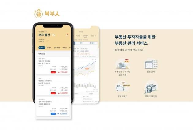 복부인이라는 프롭테크업체는 다소 생소한 기업이다. 하지만 모바일 앱 출시 1년이 지나 부동산 투자자들 사이에서는 조금씩 알려지고 있는 부동산 관리 서비스다. 복부인은 회사 이름이자 보유하고 있는 부동산을 잘 관리할 수 있게 해주는 모바일 앱 서비스이다. 이를 통해 보유하고 있는 아파트를 주식처럼 상승·하락을 확인하고, 보유하고 있는 부동산의 계약조건·대출·임차인·실거래가 확인이 가능하다. 또 전세만기,월세입금,세금 납부일 등의 일정관리와 양도세,종부세,취득세,중개수수료 등 9가지 부동산 계산기능을 갖추고 있다.